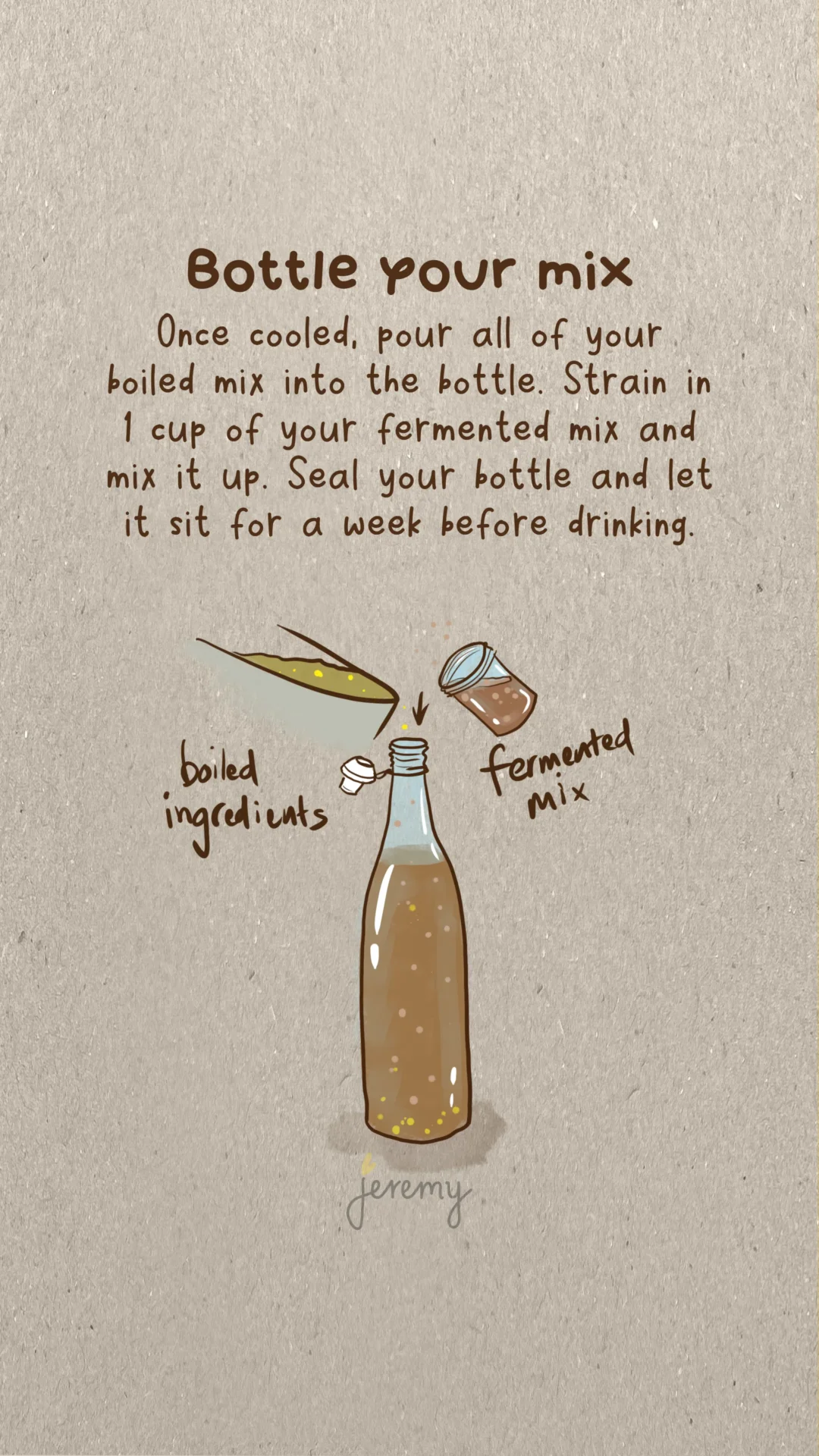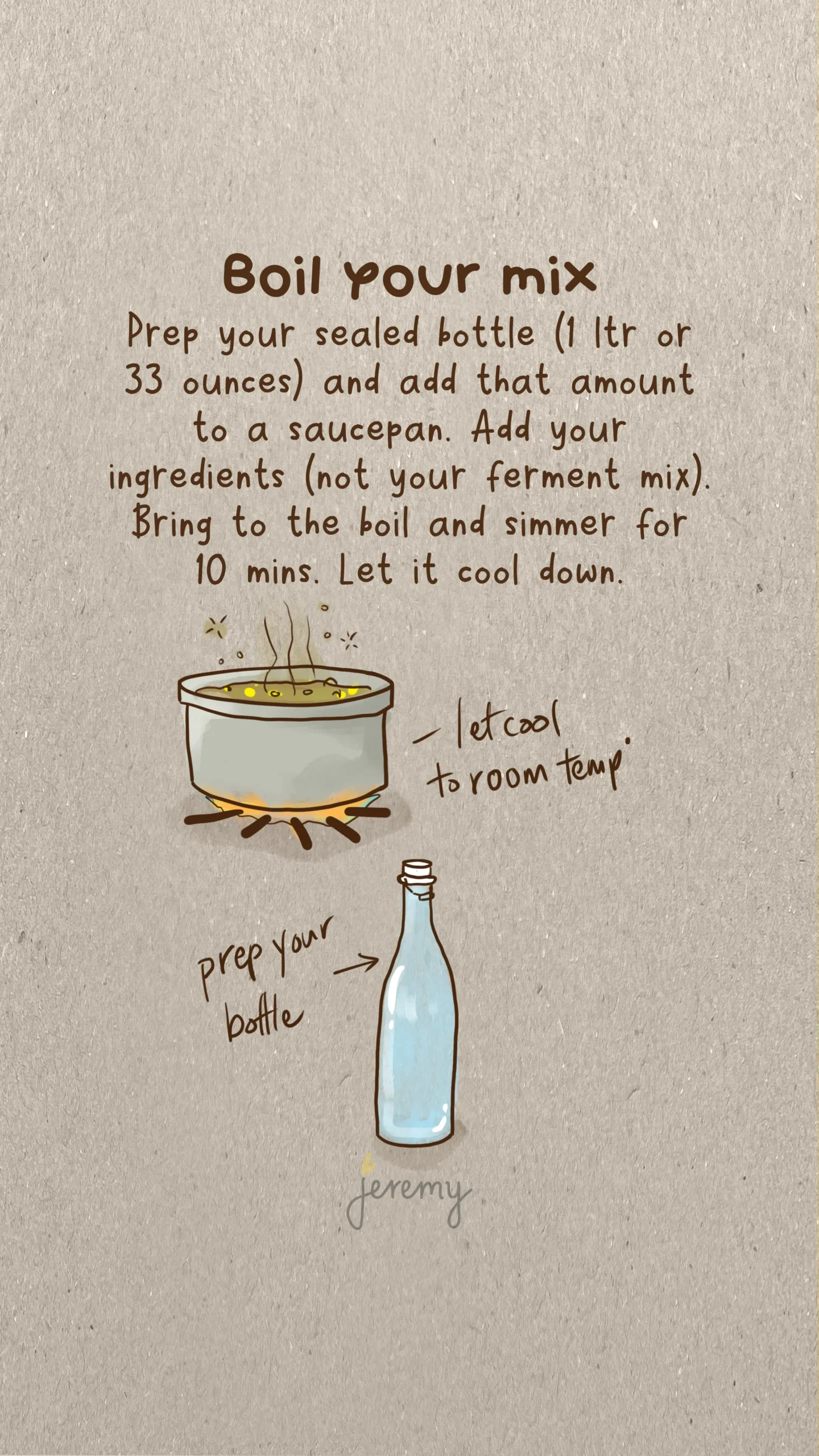 Put your boiled mixture (including the fruit) into your sealable bottle (I use these flip cap ones) and add a cup of your ferment mix (or half will do). Give it a gentle roll upside down to mix. Sit it in a cool, dark area to ferment for a week or two.