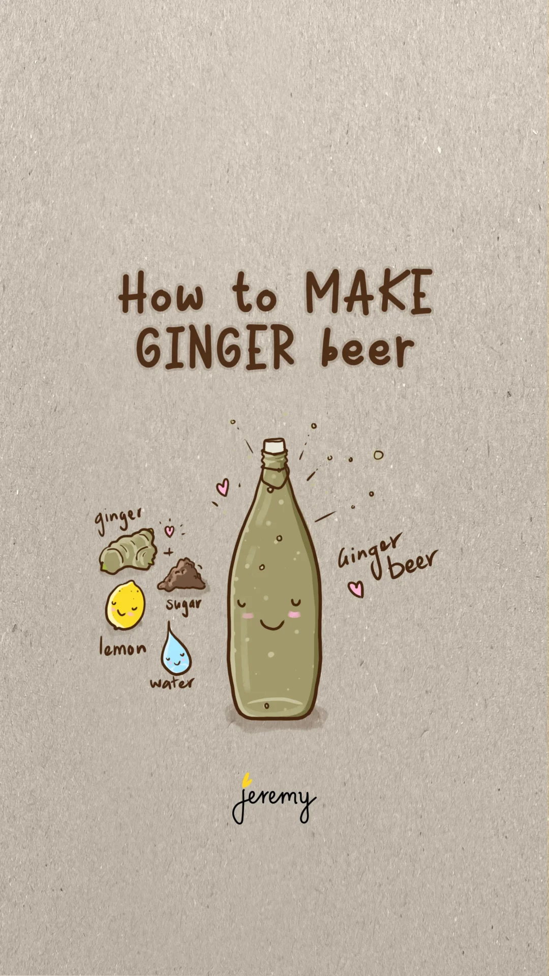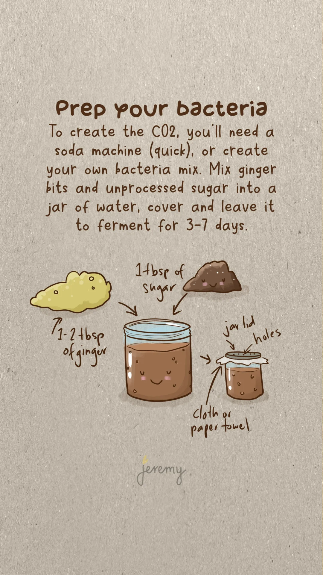 Start off by making your ferment mix (ginger plant). Sugar, water and ginger bits in a jar and let it ferment and bubble for a week. Warm weather helps this whole process.