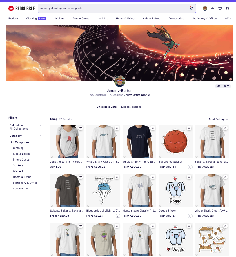 I upload a lot of my art to here so it’s available on different merchandise options. I don’t have all of the options and focus on t-shirts, stickers and tote bags.